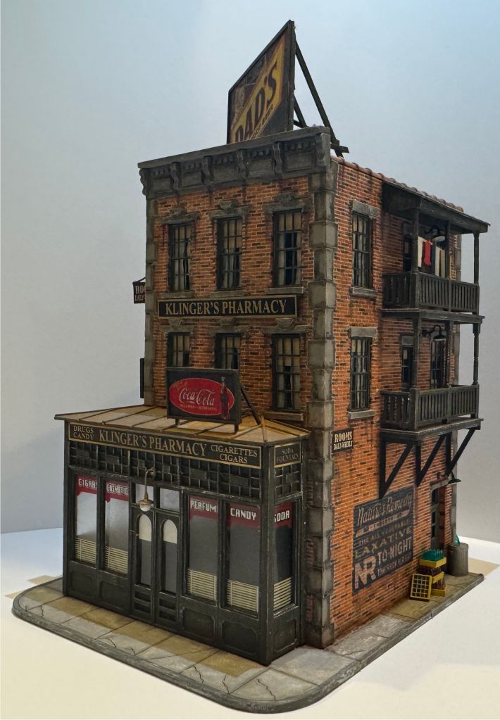 Nestled on the corner of a bustling cobblestone street, Klinger’s Pharmacy has been the heart of the neighborhood since 1923, where townsfolk once gathered not just for prescriptions, but for candy, cigars, and the latest local gossip. Beneath the glow of the old Coca-Cola sign and the towering Dad’s Root Beer billboard, the shop’s wooden door welcomed generations of customers with the familiar chime of its brass bell. Upstairs, the smell of lavender from the perfume counter would drift up to the rented rooms, where traveling salesmen and lonely poets alike found rest. Though time has marched on, the building still stands proud, a brick-and-mortar memory of a slower, kinder era.